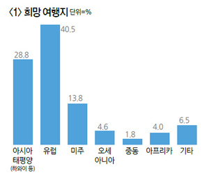 소비자들에게 ‘꿈의 여행지’를 물었다. 여행비용이나 기간, 이동거리 등 현실적 여건에 구애 받지 않고 평상시 꼭 가고 싶었던, 버킷리스트 여행지! 작년은 아·태, 올해는 유럽여행 예산이나 여행기간 등 현실적인 걸림돌이 없다면 가장 가고 싶은 해외여행지(희망 여행지)는 어디일까? 일단 넓게 대륙별로는 유럽이 가장 많은 표를 받았다. 희망여행지를 묻는 질문에 40.5%가 유럽을 꼽았고, 아시아·태평양 지역이 28.8%로 그 뒤를 이었다. 매해 조사에서 현실적 여건에 구애받지 않고 꼭 가고 싶은 희망여행지로 아·태 지역과 함께 양대 산맥