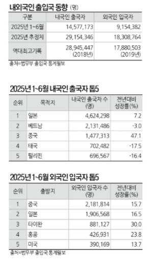 올해 우리나라 인-아웃바운드 여행산업 규모가 역대 최대 규모에 이를 전망이다. 최초로 내국인 출국자 3,000만명, 외국인 입국자 2,000만명 시대를 열지도 관심사다.법무부가 항공기의 최초 도착지 및 최종 출발지를 기준으로 산출한 ‘출발·도착지별 출입국자 현황’에 따르면, 2025년 상반기 내국인 출국자 수는 1,457만7,173명으로 전년동기대비 3.8% 증가했으며, 외국인 입국자 수는 915만4,382명으로 14.5% 늘었다. 상반기 출입국 규모를 하반기에 그대로 적용하면 2025년 연간 출국자 수는 2,915만4,346명,