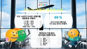 전 세계 여행객들이 다시 가고 싶은 여행지는 어디일까. 아고다가 8월1일~19일 아고다 플랫폼을 통해 한국을 포함한 아시아 10개 국가, 약 4,000명을 대상으로 진행한 설문조사에 따르면 재방문 상위 여행지로 일본, 베트남, 태국, 필리핀, 대만이 5위권 안에 이름을 올렸다. 한국인 여행객의 69%는 좋아하는 여행지를 다시 찾는 것으로 나타났다.아고다는 가장 좋아하는 여행지를 재예약한 여행객들을 대상으로 설문조사를 실시한 결과, 한국인 응답자 중 가장 높은 비율(28%)이 ‘휴식(육체적, 정신적)’을 여행의 주된 목적으로 꼽았다.